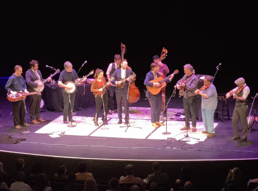Chris Thiele, Bela Fleck, and 10 other musicians on stage.